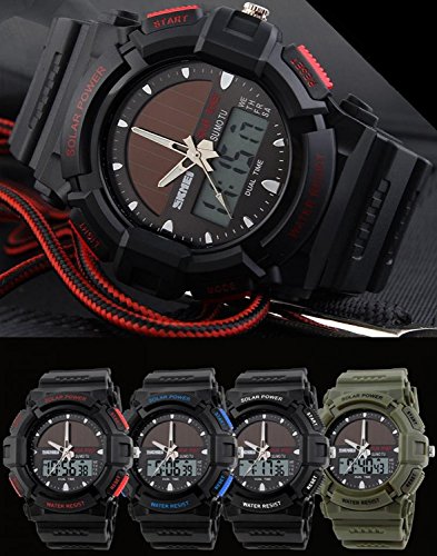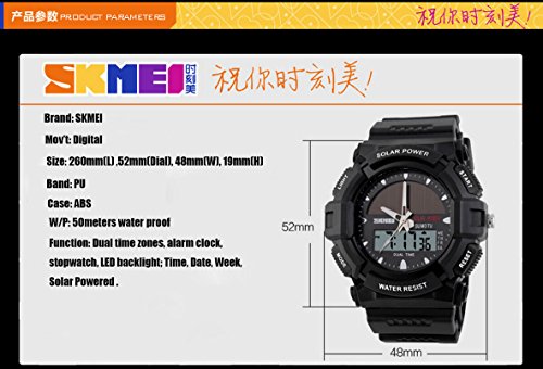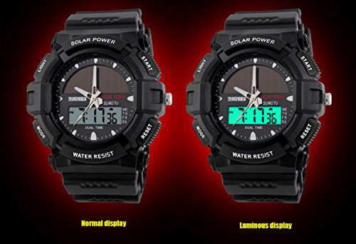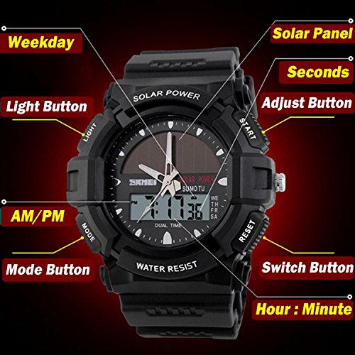 - Feature : Solar powered battery sports watch / Super cool analog-digital design / Dual time zones, alarm clock, stopwatch, LED backlight; / Rubber band is smooth to wear and sturdy in structure / 5 ATM water resistance for convenience in your daily life
