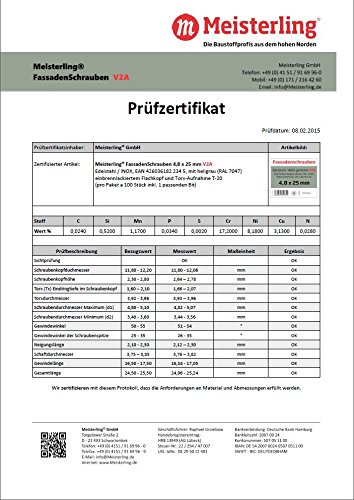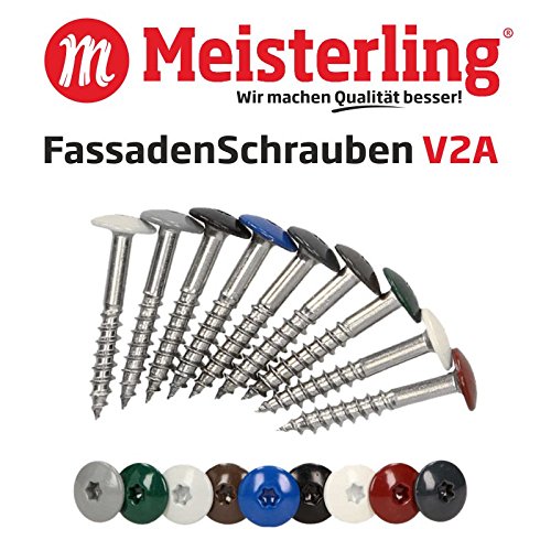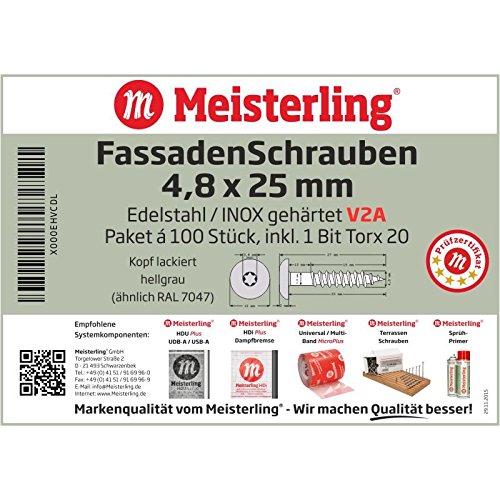 Meisterling® FassadenSchrauben 4,8 x 25 mm in V2a Edelstahl / INOX, mit farbig einbrennlackiertem Flachkopf und Torx-Aufnahme T-20, (pro 100 Stück inkl. 1 Bit), hellgrau (ähnlich RAL 7047), 4,8 x 25 mm in V2a
