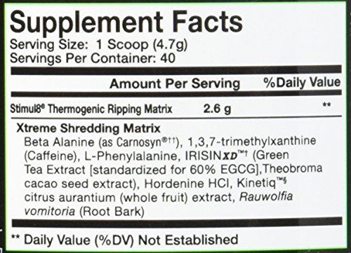Stimul8 your shredding pre-workout. Stimul8 is built with ingredients designed to propel workouts to the next level. Powered by IRISINXD a patent pending blend of exotic stimulants, stimul8 engages the body into a state of extreme thermogenesis, slicing through adipose tissue while preserving and increasing lean muscle mass. Destroy workouts with unparalleled energy delivered by the xtreme shredding matrix and experience ultimate endurance, strength and power fueled by beta alanine.Feature