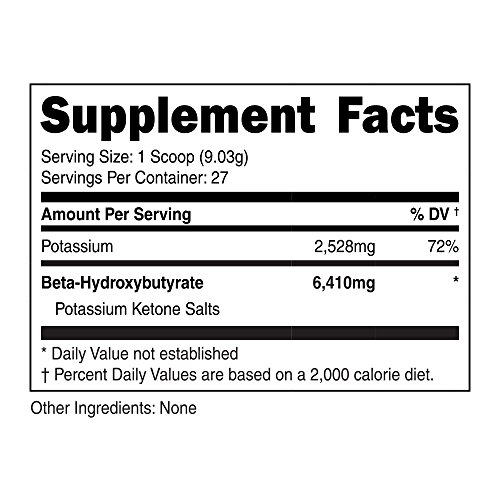 -. Feature : 6.41 Grams of Beta-Hydroxybutyrate (BHB) Per Serving / 27 Servings Per Bottle / 250 Grams of Potassium Ketone Salt Per Bottle / Serving Size: 9g (Scoop Included) / Non-GMO, Gluten Free, and Made in the USA
