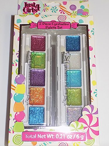 -. Feature : Just 4 Girls 2 Piece Glitter Eyeshadow Palette Set / Each Palette has 5 glitter shadows and a sponge tip applicator (two palettes total) / Colors: Medium blue glitter, white with silver glitter, light blue with green glitter, lime green glitter, silver with iridescent glitter, rose gold glitter, another lime green glitter, royal purple glitter, orange glitter and another medium blue glitter