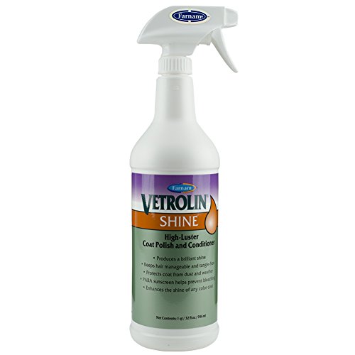 Product Description Contains Vitamin B5 For Brilliant Shine. Paba Sunscreen Helps Prevent Bleaching. Ready-to-use spray puts a brilliant shine on coats, manes and tails, includes vitamin b5, conditioners and paba sunscreen. Also protects coat from dust and weather makes manes and tails more manageable. The familiar vetrolin fragrance will not attract insects. Spray a fine mist over entire horse. After shampooing, remove excess water. Brush in direction of hair growth. For best results, bathe your horse with vetrolin bath conditioning shampoo before applying vetrolin shine.