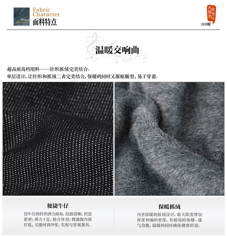 面料细节:针织牛仔不倒绒的贴身保暖设计,可省去秋裤的臃肿穿法,直接贴身穿着