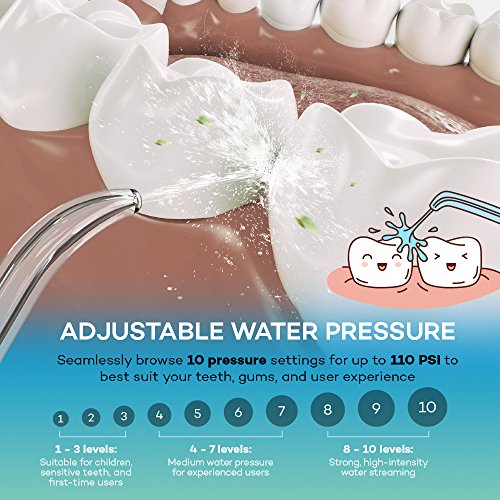 Adjustable Water Pressure: Seamlessly browse 10 pressure settings to best suit your teeth and user experience; easily adjust the water streaming up to 110 PSI with the built-in knob