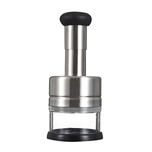 -. Feature : Fashion design and convenient to carry and clean / Press the top button to cut the onion or garlic, easy and convenient / Chop different vegetable easily and quickly by pressing / The Squeezer is made of durable and practical stainless steel / Dimensions: 21 x 9cm (H*D)
