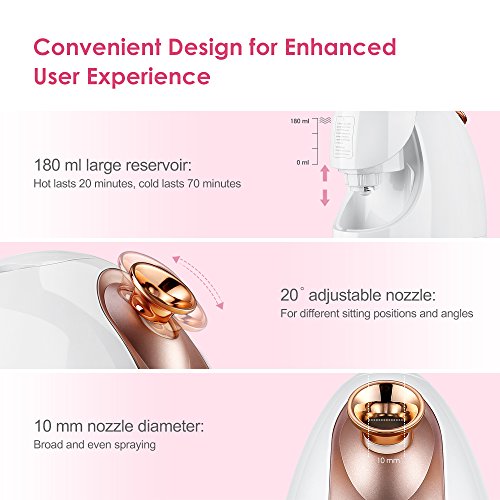 -. Feature : A OF FACIAL STEAMING: Combines multiple functions in one device; use the nanoionic steamer with adjustable nozzle for cold/hot steaming andessential oil steaming; attractively packaged to make a great gift for girlfriends, wives, mothers and other loved ones / SAY GOODBYE TO TRADITIONAL FACIAL STEAMING: Add fruits, essential oils, dried flowers or hydrolats for an even richer experience; multiple naturalsteaming therapies cater for a wide range ofskin types / COLD & HOT STEAMING TO HYDRATE SKIN: With a 10 mm diameter nozzle, it provides broad coverage and consistent steam; 70-minute cold steaming calms skin that is sensitive, sunburned or has acne; 20-minute hot steaming hydrates and cleanses skin, especially during dry seasons of autumn and winter / USER-FRIENDLY DESIGN: Dustproof nozzle cap ensures a hygienic experience; 20° adjustable nozzle allows you to enjoy different sitting positions and angles; 180 ml large reservoir means you can enjoy a longer steam; use with trust as the steamer automatically shuts off when there is no water / NANO FACIAL STEAMER: Not all steamers on the market are able to distribute nano ionic steam like Lavany Nano Ionic Facial Steamer; the ultra-fine nanoionic steam effectively penetrates deep into the skin, providing a better hydrating effect and leaving the skin smooth, supple and hydrated