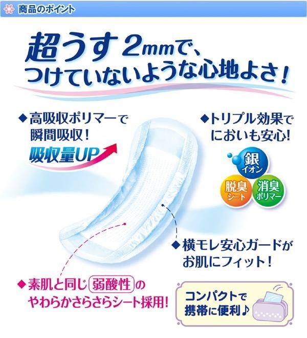 | 仕様 | 目安吸収量:~120cc 弱酸性表面シート採用 トリプル消臭(脱臭シート・銀イオン・消臭ポリマー) 尿ケア用ナプキン 多い日も安心用 |
