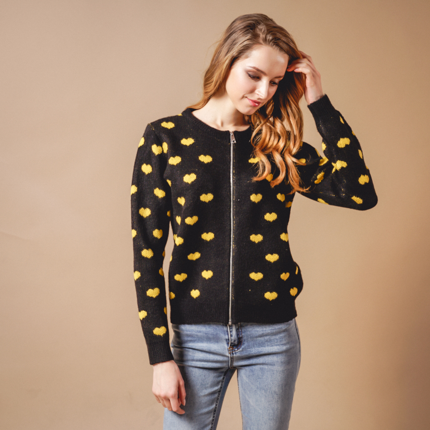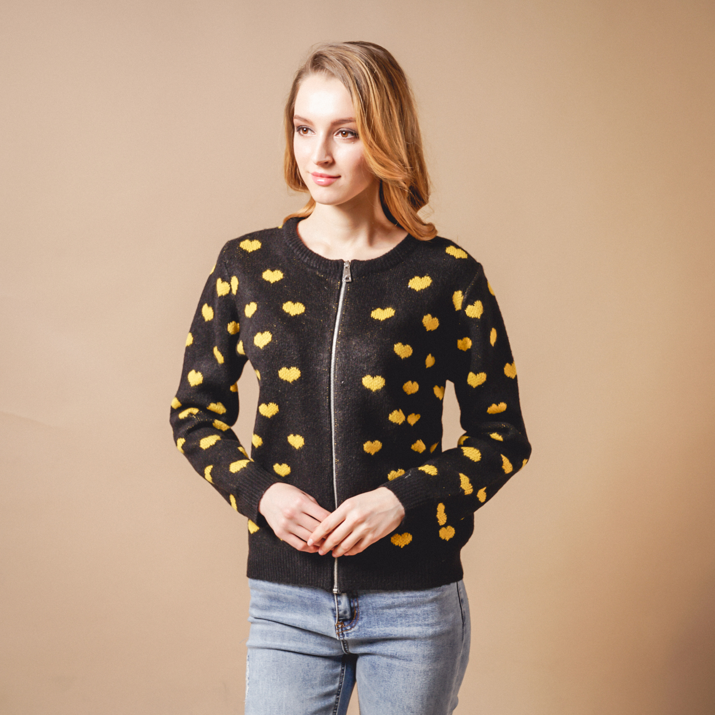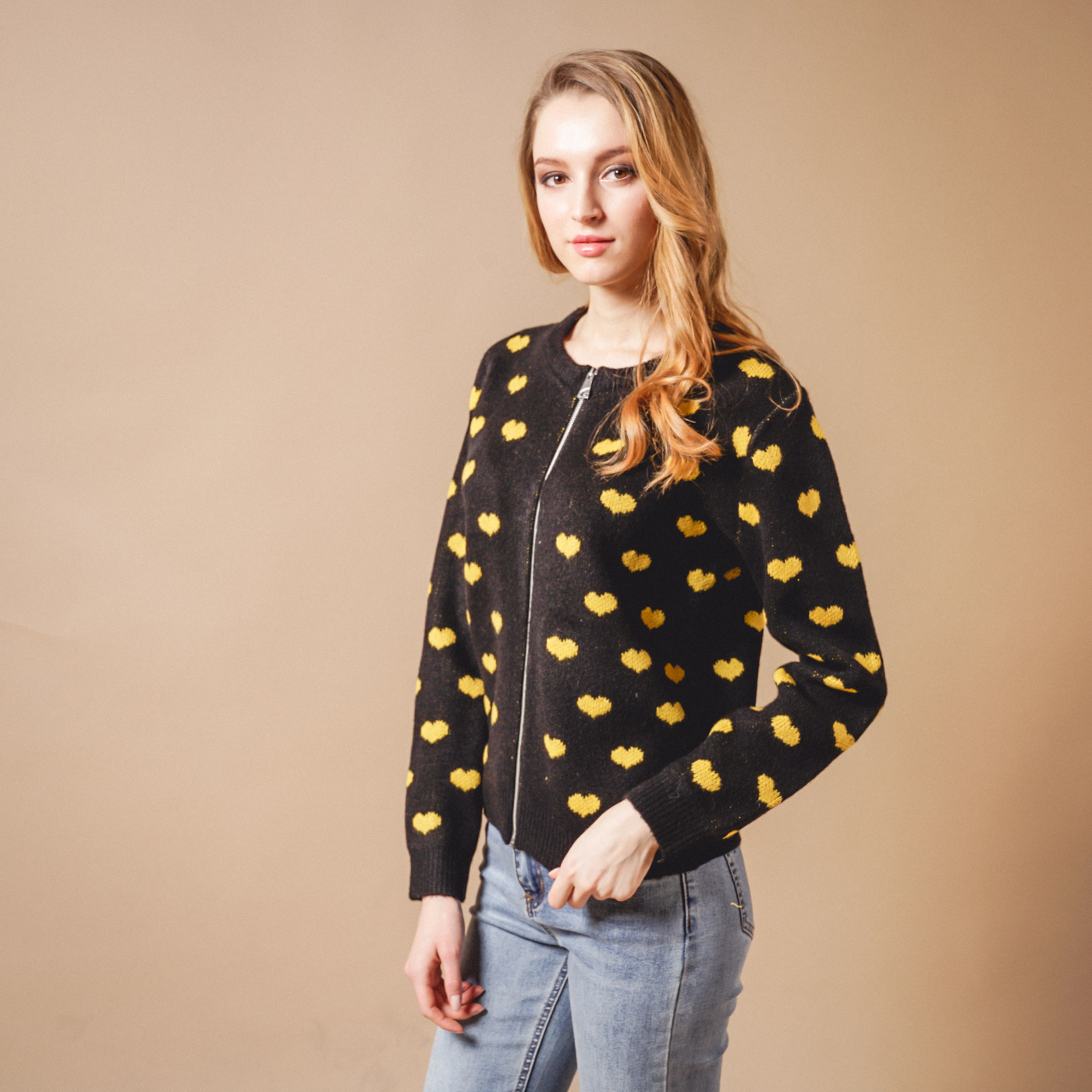 귀여운 하트패턴의 톡톡한 소재의 니트 가디건입니다.