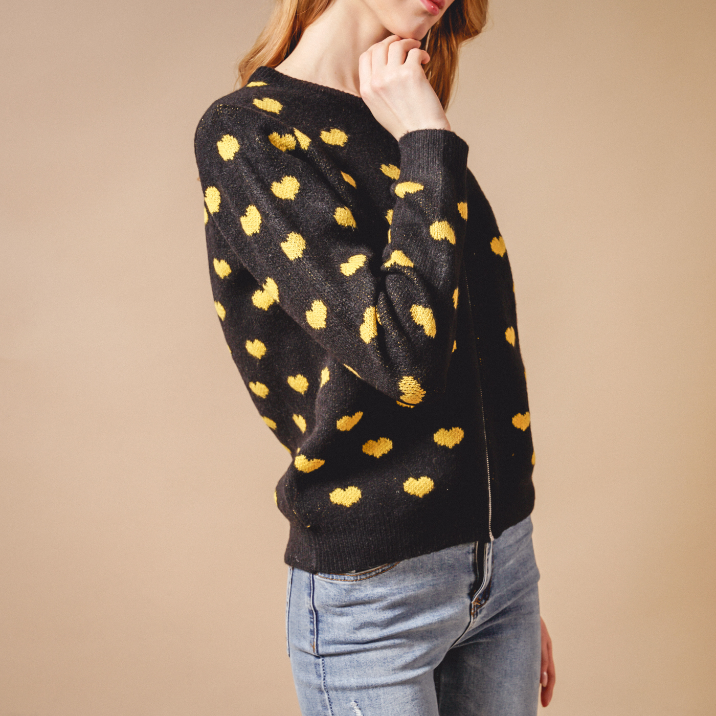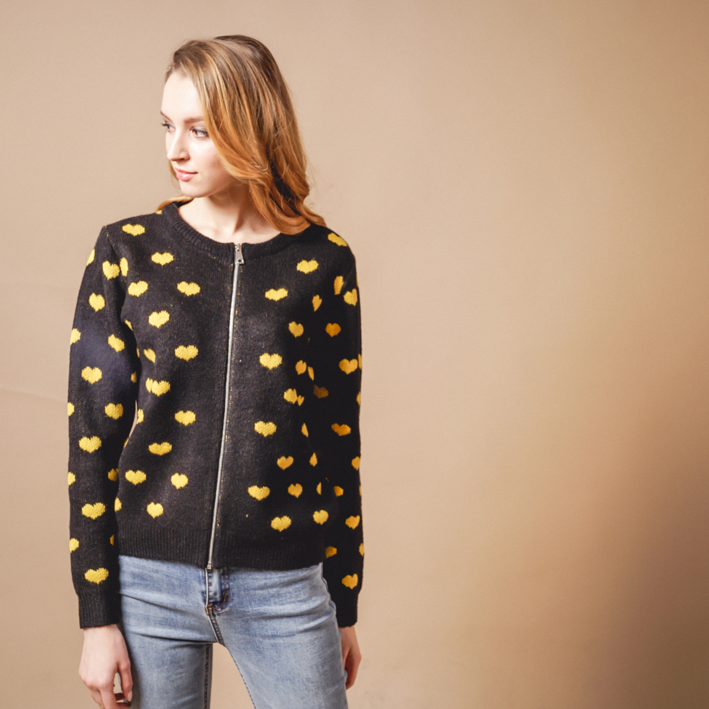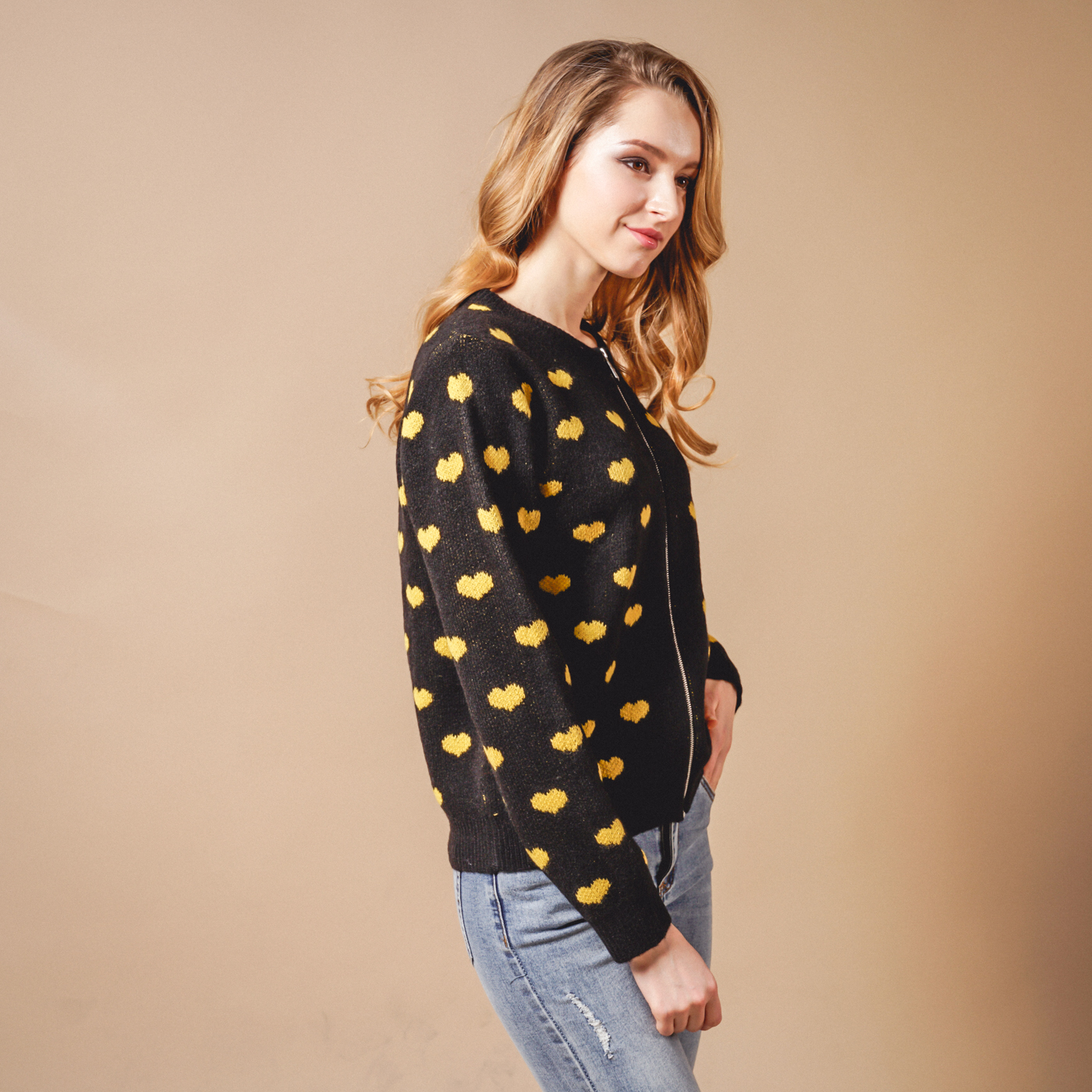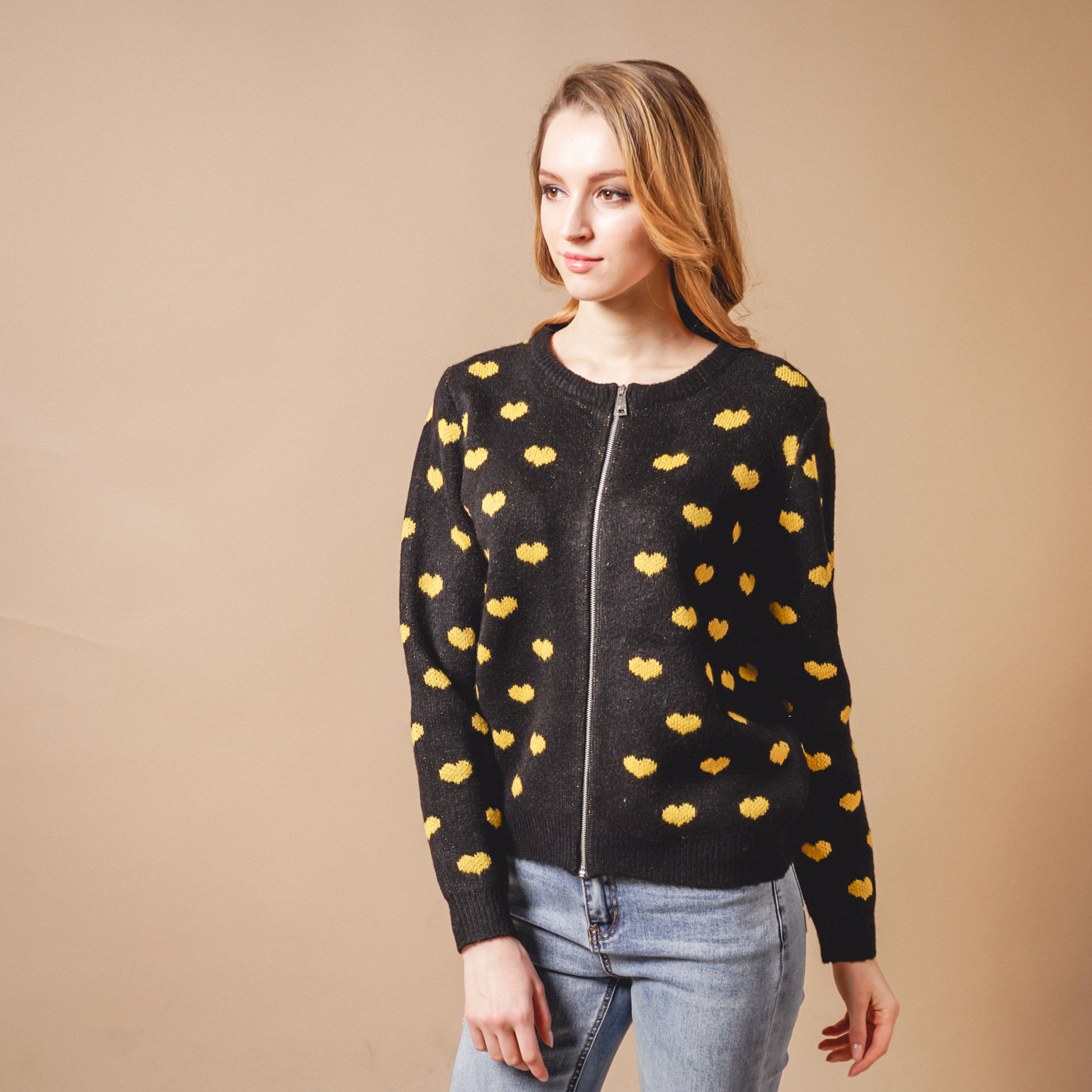 귀여운 하트패턴의 톡톡한 소재의 니트 가디건입니다.
