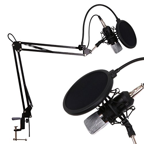 -. Feature : ♬Adjustable: 360 degree flexible gooseneck provides adjustment of any angle or position as you want. / ♬Suspension Scissor arm stand: Durable and Sturdy. it is made of durable steel material, and can be sturdily mounted on the announcers' table with the table mounting clamp. / ♬Shock Mount: the anti vibration shock mount is made of solid material and reduce the trill caused by vibration effectively. / ♬Protective POP Filter: the double nylon net microphone wind screen pop filter helps you against plosion and popping to get your best vocal recordings. / ♬Good Sound Effect Microphone: the condenser microphone adopts complete electronic circuit control and gold-plate diaphragm capsule, with a good cardioid polar pickup pattern, the microphone minimizes background noise and accurately records the most subtle sound.
