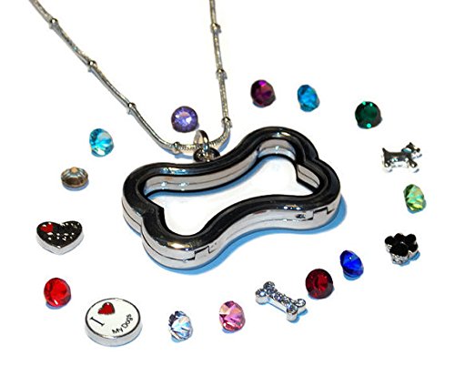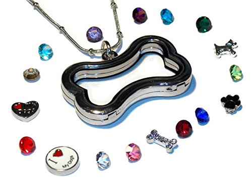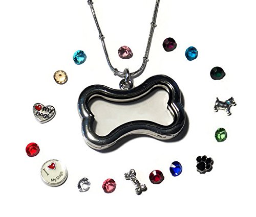 Dog Lover Floating Locket Necklace Kit - Bone Shaped Locket + Set of 12 Birthstones + Set of 5 Dog Lover Themed Floating Charms - Old School Geekery TM Brand Locket and Accessories