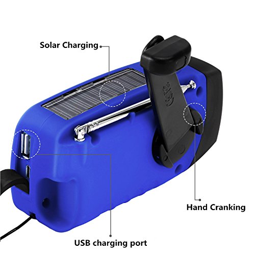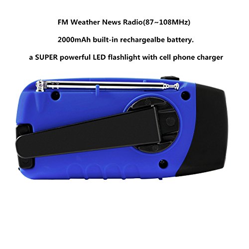 The FM radio with flashlight can be used in emergency and survival situations to light up dark spaces and areas,it's a cell phone charger can be charged iPhone, iPads, MP3s/MP4s, any other USB devices to keep you connected and powered,it's also a weather radio to provide up to date weather information to ensure safety and preparedness when you are participating in outdoor activities. Waterproof rubberized housing make it a ideal for hiking, camping, stored in a car trunk, or any emergency kit Extra wristlet to keep security As a self power emergency radio that you and your family can depend on anytime,anywhere, any weather. FM Band: 87~108MHz Battery capacity: 2000mAh 5V0.3W30mAh solar panel 1W Powerful LED> 15000mcd Hand Crank Lifetime: More than 2000 Hours Package included: 1x Solar power radio flashlight 1x English Manual 1x USB Cable 1x Retail box