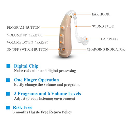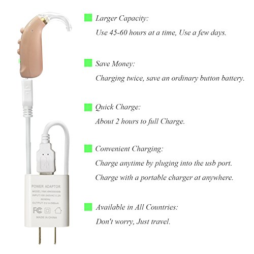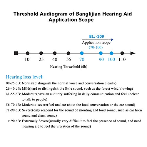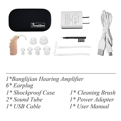 Studio : Banglijian Publisher : Banglijian Product Description Our hearing amplifier is convenient and durable to wear. It runs with high quality built-in rechargeable lithium battery, Its great battery runs around 45-60 hours continuously after fully charged, Charging time is about 2 hours. It can be charged via USB cable. Warm prompt: Please turn off the power before assembling the hearing aid. Please charge the device fully before first use. Charging the device properly, don't charge the battery overnight, usually 2-3 hours on it. Please turn off the charger when the indicator light stays green. Overcharging will damage the inbuilt battery. Don't do this often! Package Includes: 1 Banglijian Hearing Amplifier 1 Shockproof Case 6 Ear Plugs 2 Sound Tube 1 Cleaning Brush 1 Power Adapter 1 USB Cable ( Can use Power Bank-5V,1A output ) 1 User Manual