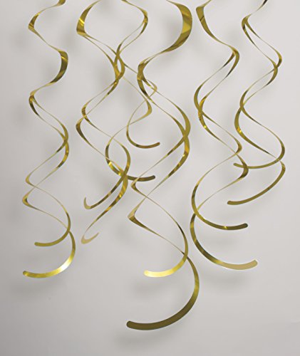 Studio : Unique Publisher : Unique Binding : Kitchen Product Description Let a shimmer of festive elegance rain from the ceiling with these Plastic Hanging Swirl Gold Decorations. These hanging decorations are a fun addition to the decor at any 50th anniversary party, bridal shower, New Years Eve party, or other holiday party. Place them in an archway for a flash of subtle color above guests' heads, let them dangle from a party table, or hang them in a window for a touch of lovely, decorative flair. 0