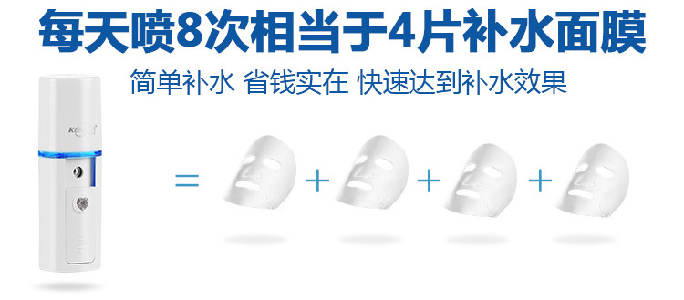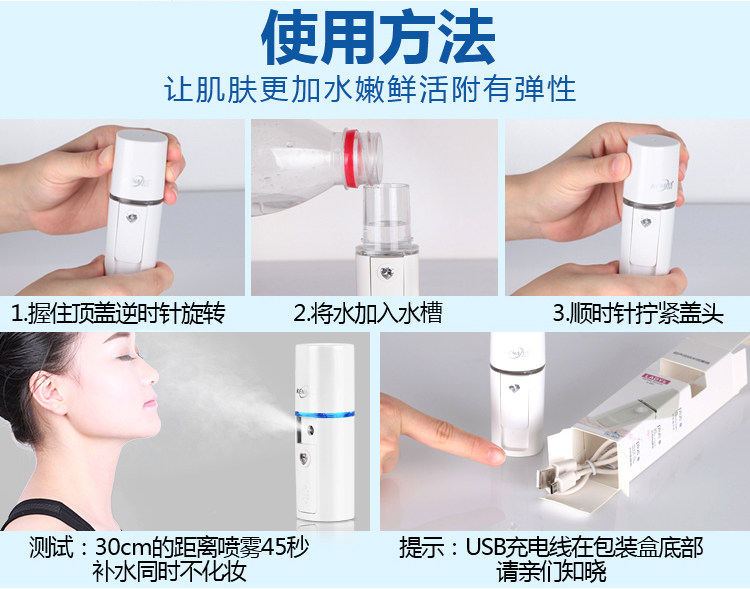 • 充电款纳米离子补水仪全新上市啦!!大水箱,真正的纳米喷雾,不花妆,60秒定时快速补水,科学设计,进口电芯,持久性长,外观小巧,可装入口袋,钱包等,随时随地补水哦,USB线