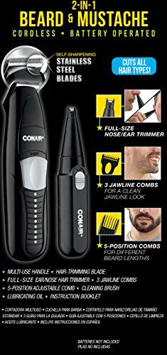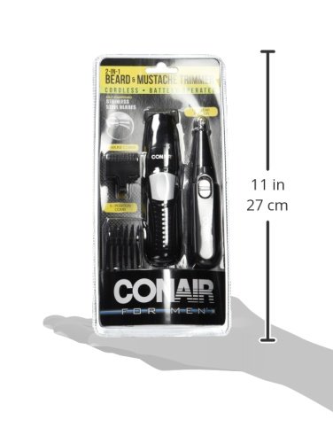 -. Binding : Health and Beauty -. Brand : Conair -. EAN : 0074108344687 -. Feature : Cuts all hair types with extreme cutting power / Full size nose and ear trimmer / 3 jawline combs / Multi-use handle / Limited two year warranty -. Label : Conair -. LegalDisclaimer : This product contains chemicals known to the State of California to cause cancer and birth defects or other reproductive harm. -. Manufacturer : Conair -. Model : GMT176CS -. MPN : GMT176CS -. NumberOfItems : 1 -. PackageQuantity : 1 -. PartNumber : GMT176CS -. ProductGroup : Beauty -. ProductTypeName : BEAUTY -. PublicationDate : 2016-09-02 -. Publisher : Conair -. ReleaseDate : 2016-08-30 -. Studio : Conair -. Title : Conair for Men 2-in-1 Beard & Mustache Trimmer; Cordless - Battery Operated -. UPC : 074108344687