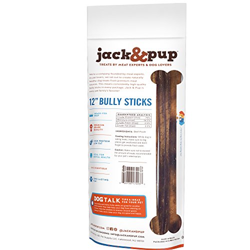 -. Feature : TOP QUALITY & HEALTHY - Jack&Pup Premium Grade Extra-Thick Bully sticks are sourced from grass fed, free range cattle; raised without any added hormones or antibiotics, resulting in a healthier and better tasting treat. Processed in a USDA Human Grade Certified and Inspected facility. Each bully stick is handpicked and inspected to ensure quality, texture and perfect consistency. Your canine will enjoy its' delicious and fresh meaty flavor! / 100% DIGESTIBLE & SAFE - Guaranteed to be fully digestible and guaranteed not to cause any side-effects. Jack&Pup Bully Sticks are a natural, low-fat and protein-rich, one-ingredient dog chew treat, being 100% beef muscle without any additives or artificial ingredients. Our careful and natural preparation of the bully sticks effectively eliminates all bacteria and contaminates; making its' consumption fully safe. / SUPPORTS HEALTHY TEETH & GUMS - By ensuring its' consistently perfect texture and thickness, Jack&Pup Bully sticks helps keep the dog's teeth healthy and clean. Effectively removes tartar build-up, strengthens the gums, removes plaque and promotes an overall enhanced oral health. / EXTRA THICK SIZE & LONG LASTING - Each Bully Stick is hand selected and sorted to ensure its' consistent thickness. Jack&Pup Extra-Thick Bully Sticks are never stretched, resulting in a 30% thicker than standard bully stick, thus lasting much longer than regular bully sticks. Jack&Pup Bully sticks are extremely safe and will never splinter. Keep your dog occupied for many hours, while chewing away on this savory beefy and flavorful dog treat! / NATURALLY ODOR FREE & FRESH - Jack&Pup Premium Bully Sticks are carefully prepared by boiling, roasting and smoking; then drying in a slow process. The multi-step process effectively locks-in the natural beef flavor resulting in an enhanced richness that dogs love. At the same time, the proP.R.Iety process naturally eliminates all odors, without the use of any additives or chemicals. Stays fresh longer without any added preservatives.