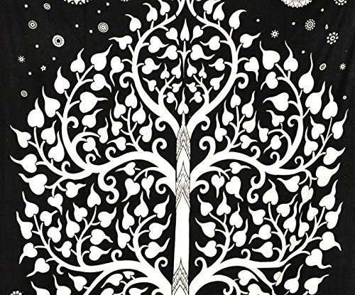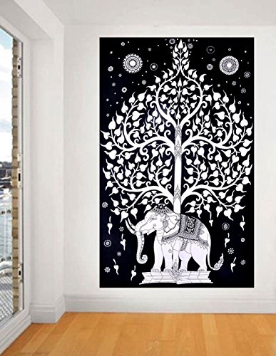Indian Elephant Tree Tapestry ,Good Luck White Elephant Tapestry , Hippie Gypsy Wall Hanging , Tree of Life Tapestry , New Age Dorm Tapestry (White/black), Twin Wall Decoration