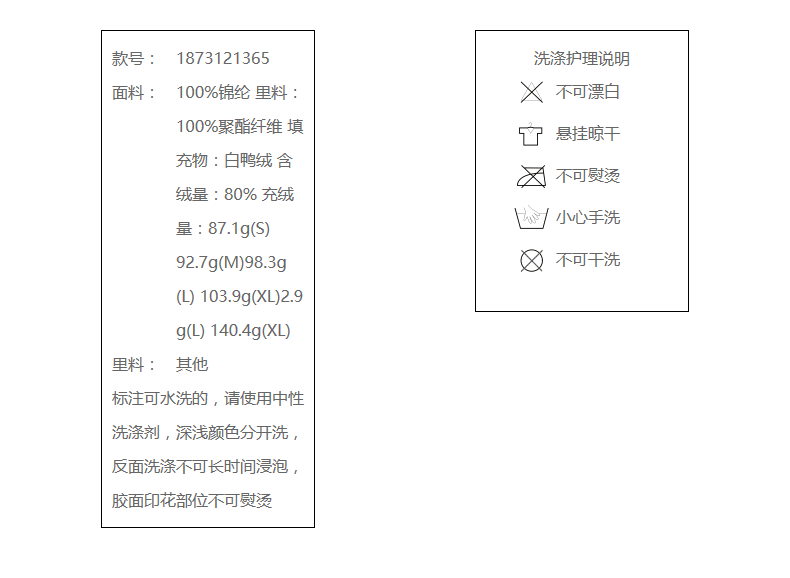 100%锦纶 里料:100%聚酯纤维 填充物:白鸭绒 含绒量:80% 充绒量:87.1g(S) 92.7g(M)98.3g(L) 103.9g(XL)2.9 g(L) 140.4g(XL)