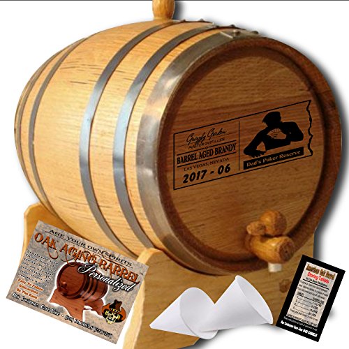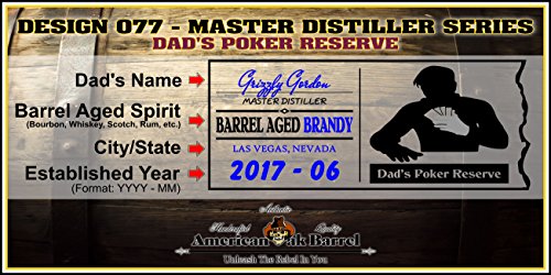 Studio : American Oak Barrel Publisher : American Oak Barrel Product Description New "Dad inspired" designs!!! Personalized American Oak Aging Barrel - Design 077: Dad's Poker Reserve - Master Distiller Series............This vessel is handcrafted from American white oak, bound by 6 hoops of steel and features a stunning laser engraved design! The barrel features a medium toast char. That char is the sugar from the oak released during the firing process. As it cools, the sugar caramelizes on the inner walls and mellows the decanted spirit. The longer your spirits age in this barrel the smoother, refined or mature it becomes. Easily accommodates a fifth of spirit. Please enjoy responibly! 0