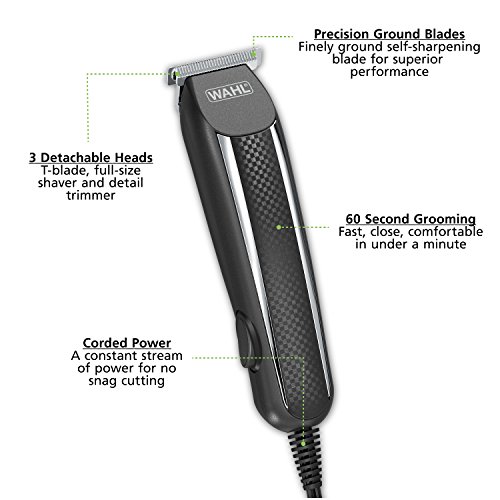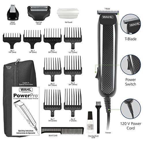 -. Feature : Features Wahl high-carbon precision ground blades for unbeatable trimming results. Includes standard width, wide T-blade, and detailing blade for beard and mustache trimming, hair cuts, touchups, body grooming and detailing. / Guide Combs - 8 individual guide combs from 1/8" to 1" to let you maintain an even length without the problems that many integrated guide systems have. / Powerful Motor - AC powered corded unit provides plenty of cutting power from its high torque rotary motor and precision machined drive components. / Shave - Full size dual floating foil shaver head with bi-directional long hair intercept cutter bar provides real shaving results from head to toe. Fully washable stainless steel foils for easy clean up. / Detail Trimmer - Full size precision detail trimmer for ears, nose, eyebrows, goatee, and detailing