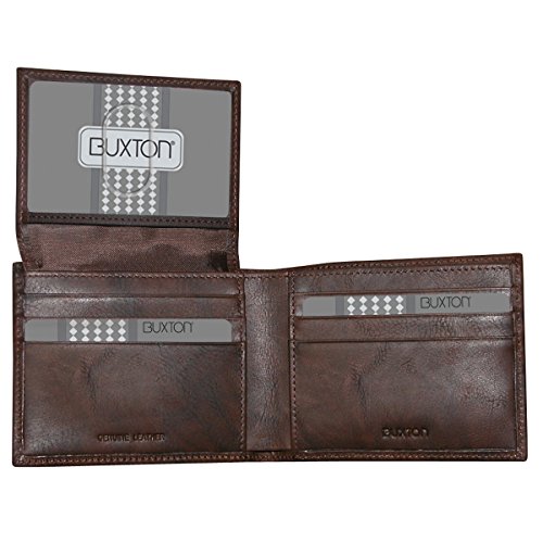 Leather Passcase Wallet by Buxton. Features a flip case with 2 ID windows, 5 card slots. Full width currency pocket and 2 hidden key holders. Passcase Wallet Dimensions: 4-1/2 x 3-1/2 inches (closed); 8-3/4 x 3-1/2 inches (open). Available colors include: Black & Dark Tan. This genuine leather passcase wallet would make a great gift!
