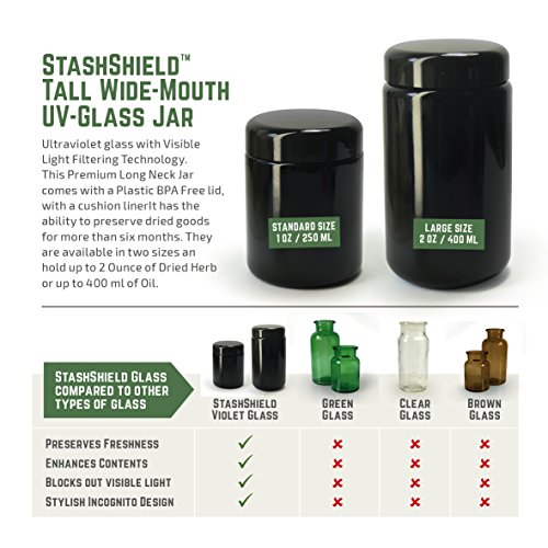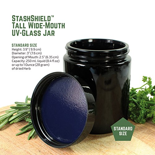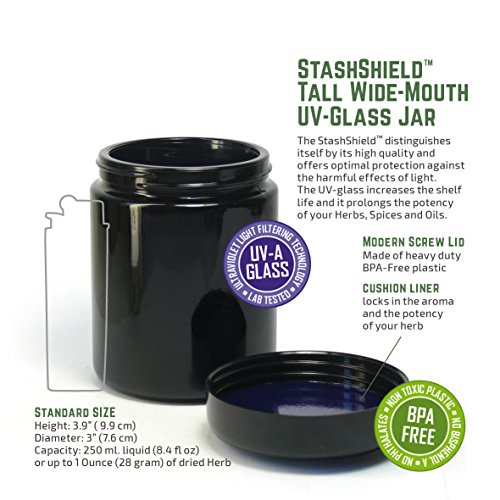 STASHSHIELD 250ML (HALF OUNCE) ULTRAVIOLET JAR - The StashShield distinguishes itself by its high quality and offers optimal protection against the harmful effects of light. Volume Capacity: 250ml (8.4 fluid oz) and will hold a half ounce (1/2 oz) or more of dried herbs | Height: 3.9" | Diameter: 3.0" | Opening of Mouth: 2.3"