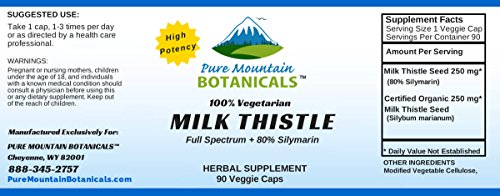 Studio : Pure Mountain Botanicals Publisher : Pure Mountain Botanicals Binding : Health and Beauty Product Description High Potency Milk Thistle. 90 Kosher Veggie Capsules. 450mg Organic Milk Thistle Seed and Extract About Pure Mountain Botanicals® We believe there's a better way to help you be your best. A better way that works naturally with your body. Since the beginning, we have been committed to providing effective botanical supplements from nature that are free from harsh solvents, fillers, and questionable preservatives. As a leader in botanical health supplements, our passion is providing the best possible products for your total health. Our promise to you is your total satisfaction. 0