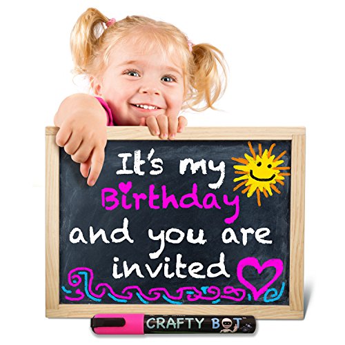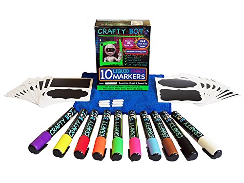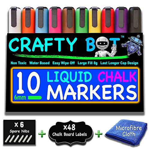 Crafty Bot Chalk Markers, Pack of 10 (8g ink), 48 Chalk board Labels, Microfiber Cloth, With 6pcs Reversible and 6mm Spare Tips, Assorted Colors. PREMIUM QUALITY: Each quality Crafty Bot marker comes with a 6mm reversible tip & filled with 8 grams of high-quality ink. 6 FREE REPLACEMENT TIPS: 6 free replacement tips extend marker use as well. 48 PCS FREE CHALK BOARD LABELS: 4 different shapes and 48pcs total free chalk board labels to stick anywhere. 1 MICROFIBER CLOTH: 1 quality microfiber cloth for easily wipe off.