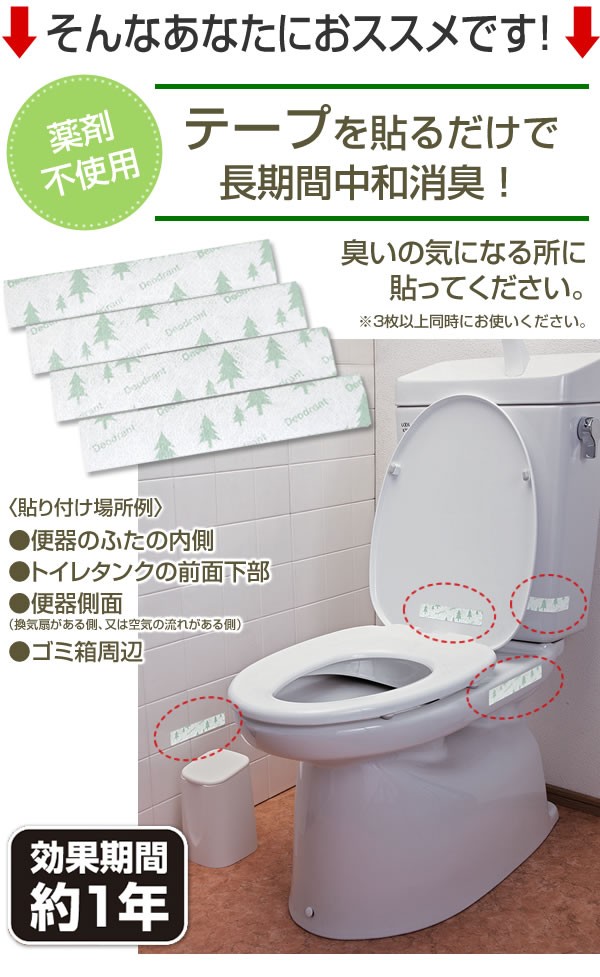 貼るだけで便器周りの臭い対策ができる消臭テープです。薬剤を使わず中和作用で消臭します。効果は約1年
