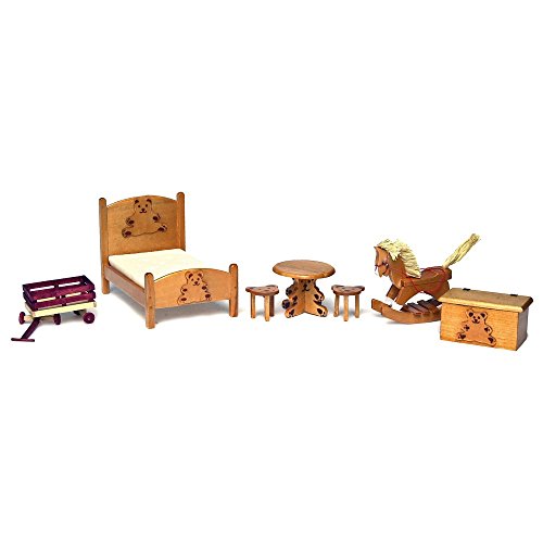 • Includes 7 pieces: table w/ 2 stools, rocking horse, bed, toy box, wagon