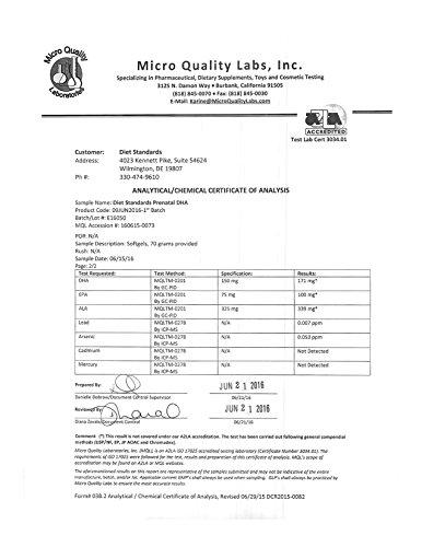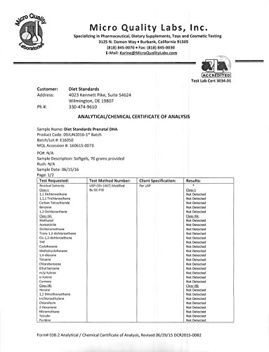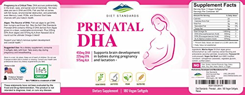 -. Feature : 100% NATURAL INGREDIENTS - Made in the USA. Diet Standards Prenatal DHA Supplement contains 450mg DHA derived from Algae grown in a clean, sustainable environment. Plus 225mg EPA (from algae) and 975mg ALA (from flaxseed oil) to create the ideal Omega-3 blend for you & your baby. Omega-3 DHA is a fatty acid that has been shown to play a big role in baby brain, nervous system, and eye development. / MADE FOR YOU & YOUR BABY - If you are pregnant, lactating, or nursing, the Diet Standards Prenatal DHA vitamins are your #1 choice. We understand that there are a lot of choices when looking for quality prenatal vitamins with DHA. And that's why we went the extra mile to create a high-quality product you can trust so you can get the highest quality nutritional nourishment for you & your baby. / 3RD PARTY LAB TESTED - Diet Standards is proud that our high-quality nutritional supplements are made in a GMP/FDA approved facility. All of our products are tested for purity at a 3rd party lab. This ensures that you are taking the highest quality Parental DHA product for you and your baby. And YES, or Parental DHA is both gluten-free & dairy-free, with the DHA coming from algae, not fish. / 2 MONTHS SUPPLY IN ONE BOTTLE - Unlike other pregnancy vitamins or supplements for pregnant women, our Prenatal DHA Supplement has 180 vegan softgels in one bottle. That's a full 60-day supply! Our soft, small, and easy-to-swallow gellcaps (all natural ingredients) ensure that you & your baby get your daily recommended amount of DHA without that unwanted aftertaste or unpleasant "fish burps". / 100% GUARANTEED OR YOUR MONEY BACK - Pregnancy is stressful enough. Let us help take a load off your purchase here. Diet Standards offers our 100% customer satisfaction guarantee. We go far beyond standard DHA products to ensure our products exceed quality and purity. But if in 30 days you are unsatisfied for any reason, we will provide you a prompt refund. We stand by (and use) our own products.