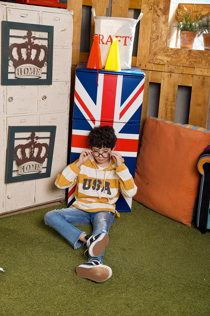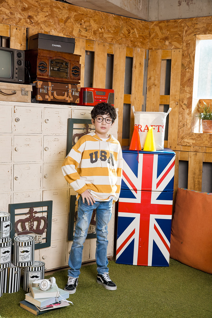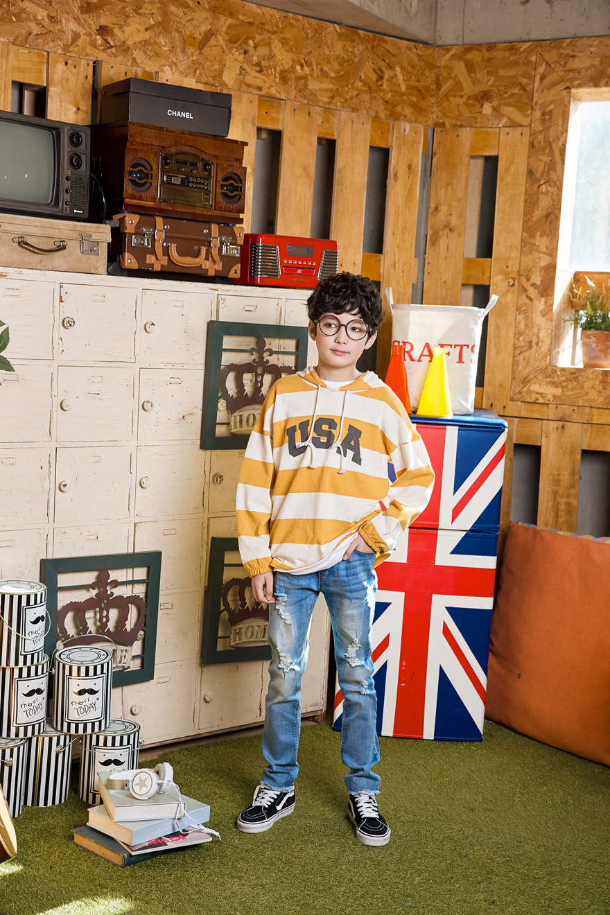9, 11, 13, 15, 17호로 준비되어 있으며 하단에 측정된 사이즈 표를 참고해 주세요. 이 제품은 표준 사이즈로 디자인 된 제품입니다. 피팅한 남아의 모델은 151cm에 34kg으로 다소 마른체격이며, 여유있게 연청 15호를 착용하였습니다. 깔끔한 핏으로 잘 맞네요 ;)