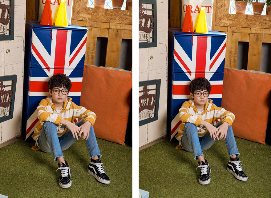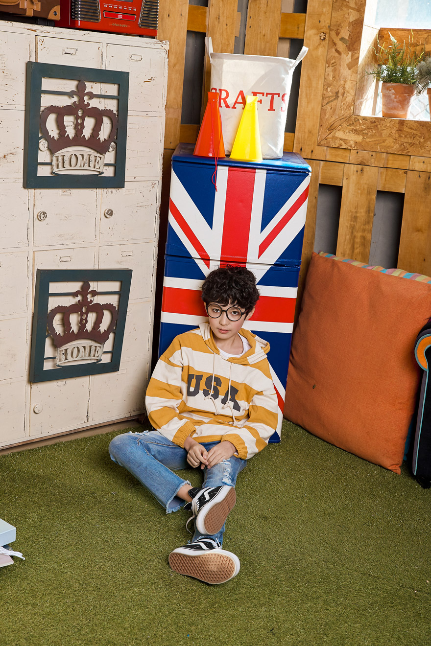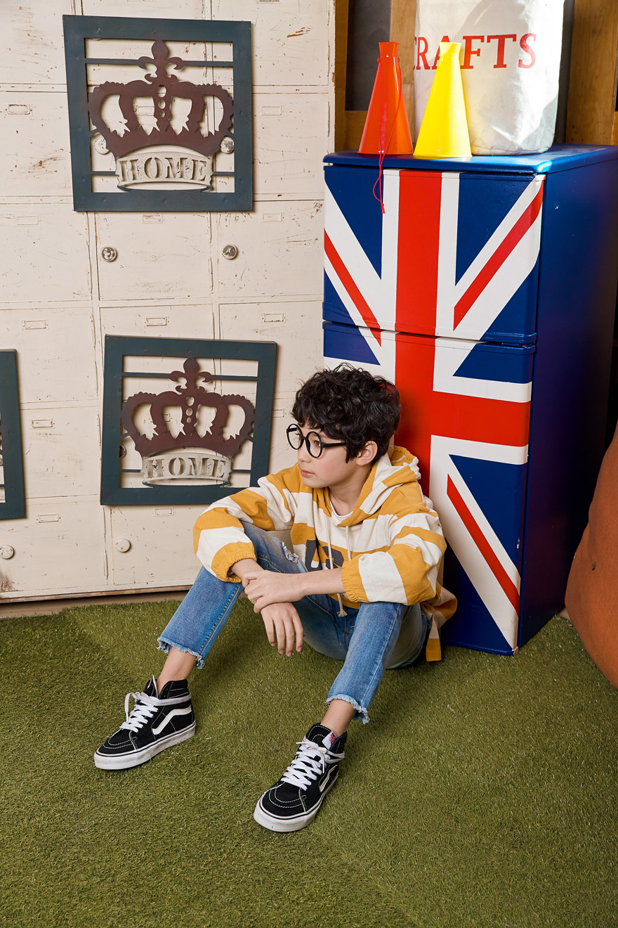 9, 11, 13, 15, 17호로 준비되어 있으며 하단에 측정된 사이즈 표를 참고해 주세요. 이 제품은 표준 사이즈로 디자인 된 제품입니다. 피팅한 남아의 모델은 151cm에 34kg으로 다소 마른체격이며, 여유있게 연청 15호를 착용하였습니다. 깔끔한 핏으로 잘 맞네요 ;)