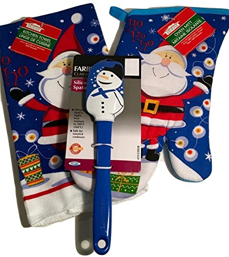 Snowman Spatula (blue, silicone); Blue & White Santa Claus Kitchen Towel and Oven Mitt; 3-pc