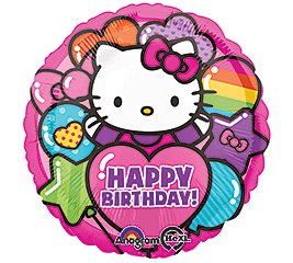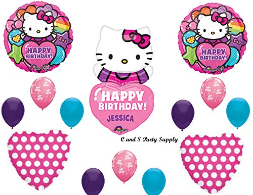 This listing is for a 14 piece Hello Kitty PERSONALIZED Birthday Balloon Decorating kit! Perfect decorations for your Hello Kitty themed party! You will receive with this kit: One (1) 33" Hello Kitty Happy Birthday balloon which can be PERSONALIZED with the birthday boy's/girl's name by simply applying the stickers that are included with the balloon! Two (2) 17" Hello Kitty Rainbow and balloons round mylar balloons. Two (2) 18" Hot Pink polka Dot Heart shape mylar balloons. Nine (9) Coordinating 11" latex balloons...3 pink with Happy Birthday imprinted in white, 3 purple and 3 island blue. All balloons are new and shipped uninflated. Just add helium!Feature