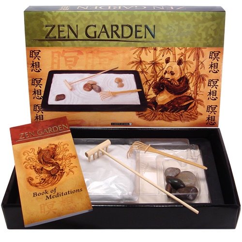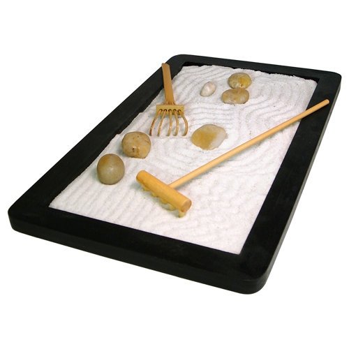 This Zen Garden from Toysmith comes with everything you need to participate in the art of Zen gardening. Includes an 11-1/2" X 7" wooden tray, white purified sand, rocks, two natural finish rakes and a booklet of meditations. Perfect for a desk or coffee table.