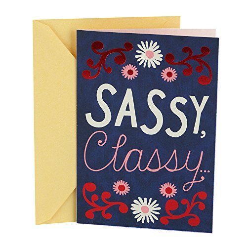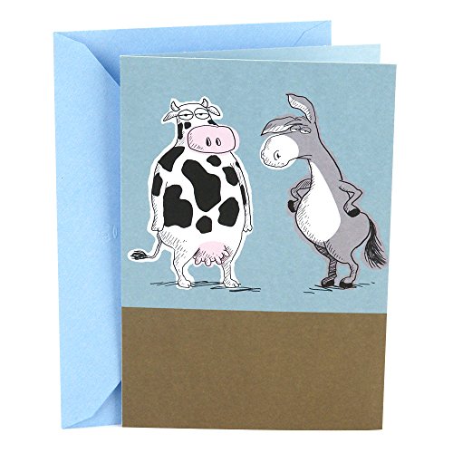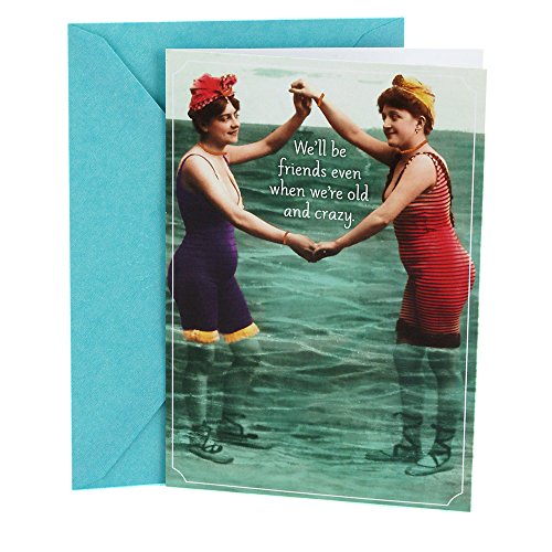 Delight friends, family, coworkers, and more on their birthday with this card featuring a colorized vintage photograph of two women standing in water and clasping hands. The message on the front of the card reads, "We'll be friends even when we're old and crazy." Open the card to reveal the inside message, "One down, one to go. Happy Birthday" The card measures 7.2 inches long by 5 inches wide made with high quality cardstock paper; an envelope is included. All Hallmark cards are made with paper from well-managed forests. Shoebox greetings are the perfect way to make someone laugh out loud. These edgy, irreverent takes on life are surprising, hilarious, often inappropriate and always timely. Hallmark was founded in 1910 when 18-year-old J.C. Hall arrived in Kansas City, Missouri, with a couple of shoeboxes of postcards under his arm and the American dream in his heart. Hallmark greeting cards are sold online and in nearly 40,000 retail stores across the globe and people continue to recognize the iconic Hallmark brand as "the very best."Feature