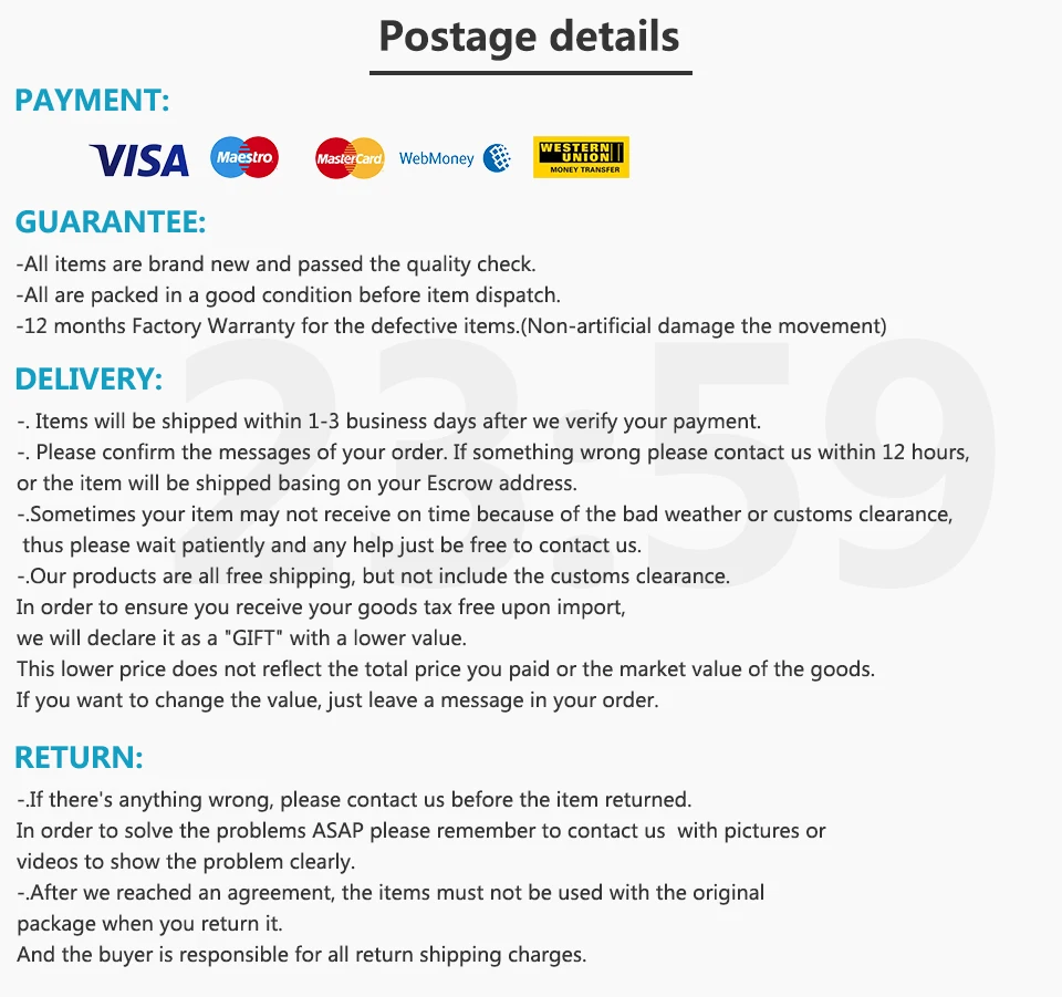 ![]() ![]() ![]() ![]() ![]() ![]() ![]() ![]() ![]() ![]() ![]() ![]() ![]() ![]() ![]() ![]() ![]() 브랜드: 리 스타일: 간단한 패션 캐주얼 석영 아날로그 손목 시계 디스플레이: 아날로그 디스플레이 운동: 석영 운동 특징: 높은 내마모성 유리; -스테인레스 스틸 backcase 하이테크 레이저 로고; -50 메터 방수. (마십시오 프레스 키 수중) -개월 공장 보증. 간단한 패션 캐주얼 시계 스타일. 높은 품질의 정품 가죽 스트랩. 사양: 케이스 직경: 3.5 센치메터 (1.38 인치) 케이스 두께: 0.3 센치메터 (0.12 인치) 밴드 길이: 22.0 센치메터 (8.66 인치) 밴드 폭: 1.4 센치메터 (0.55 인치) 포장 목록: -1 x 원래 리 시계 -1 x 선물 상자 ![]() ![]() 포장 상세
