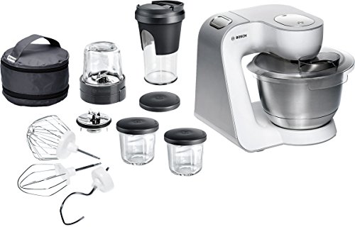 -. Feature : Extra starker Motor (900Watt) für anspruchsvolle Teige und schnelle Verarbeitung / Vielseitig einsetzbar mit Patisserie-Set (Schlagbesen, Rührbesen, Knethaken) und kompaktem Multi-Zerkleinerer-Set mit 5 Funktionen: Mühle, Universalzerkleinerer, Mixer sowie praktische Aufbewahrungs- und ToGo-Lösung. / Große Rührschüssel aus Edelstahl (max. Teigmenge 2,0 kg) und 7 Arbeitsstufen plus starker Momentstufe für grenzenlosen Backspaß / Easy Arm Lift: Einfache und kraftsparende Ein-Knopf-Bedienung des multifunktionalen Rührarms mit 3 Antriebsstellen / Einfach und sicher zu bedienen (Bosch Technik); leicht zu reinigen (Spülmaschinen geeignetes Zubehör) / Lieferumfang: 1 x Rühr-/Schlagbesen, 1 x Deckel, 1 x Edelstahl-Rührschüssel, 1 x Knethaken Metall, 1 x Zubehörtasche dunkelgrau, 2 x Messer-Schutzkappe, 3 x Glas mit Aufbewahrungsdeckel, 1 x ToGo Mix-/Trinkbecher, 1 x Hack-/Mixmesser, 1 x Mahlmesser