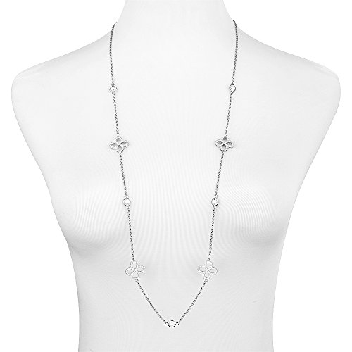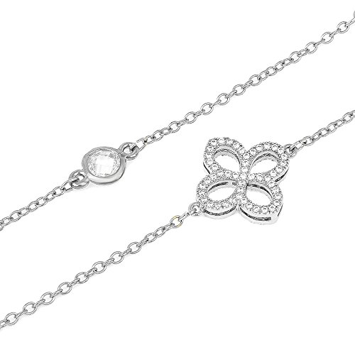 Features pave CZ open four petal flower stationed across thin chain, together with chess cut CZ piece.