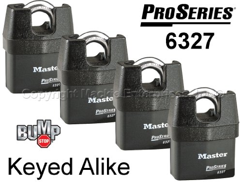 -. Brand : Master Lock -. Feature : This listing is for four (4) locks measuring 2-5/8" (67mm) wide with a laminated steel body for superior strength. Locks have the BUMP STOP technology. / Also available in a 2-pack and 3-packs. Search 6327NKA in our store front. / Hardened boron alloy shackle for superior cut resistance. Solid iron shackle shroud resists harsh physical attacks. / Removable cylinder can be replaced or repinned. 5 spool pin tumbler cylinder for added pick resistance. / Dual ball bearing locking mechanism resists pulling and prying. -. IsAutographed : 0 -. IsMemorabilia : 0 -. Label : Master Lock -. Manufacturer : Master Lock -. Model : 6327NKA-4 -. MPN : 6327NKA-4 -. PackageQuantity : 4 -. PartNumber : 6327NKA-4 -. ProductGroup : Automotive Parts and Accessories -. ProductTypeName : AUTO_ACCESSORY -. Publisher : Master Lock -. Studio : Master Lock -. Title : Master Padlock - High Security Locks 6327NKA-4 BUMP