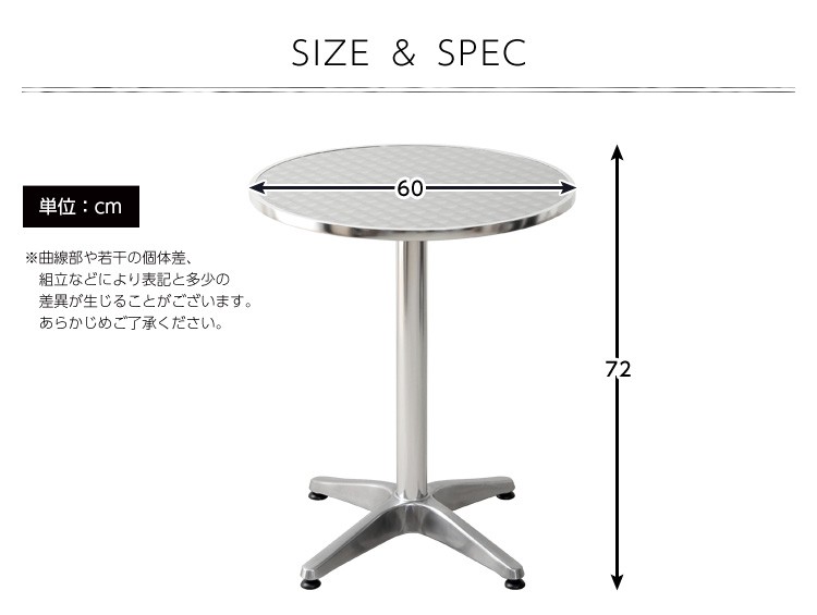 【商品について】 ガーデン丸アルミテーブル【カメリア -CAMELIA-】(ガーデン 丸 テーブル 60幅) ■サイズ: 外寸:(約)60x60x72cm ※商品重量:(約)6kg ■カラー: 通常販売分 ■素材: アルミニウム(アルマイト仕上げ)、スチール(エポキシ樹脂塗装)、パーティクルボード ■その他: ・お客様組立商品です ・梱包サイズ:(約)62x61.5x13.5cm(1.9才) ・梱包重量:(約)7kg ※メーカー直送品、商品代引き不可【商品について】