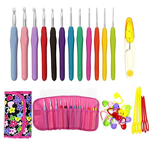 - Our new high-grade crocheting suit contains 12 TPR soft handle crochet hooks, 1 bag with little flower pattern, 15 stitch markers, 6 plastic sewing needles, 1 pair of scissors .