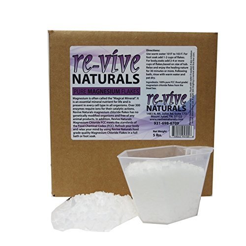 Bring the invigorating power of magnesium into your life with Re-vive Naturals Magnesium Chloride Flakes. Relax and refresh your body with food-grade magnesium chloride, an essential mineral for many biochemical functions. Extracted from the mineral-rich waters of the Dead Sea, these flakes are free of chemical impurities, safe for use internally and for skin application. Dissolve a cup or two of the flakes in water for a soothing bath or foot soak, or mix a smaller amount with mineral oil for massaging achy joints and muscles. Available in 1.5-, 3-, 5-, 12-, 24-, and 35-pound sizes, these flakes offer a cost-effective solution and quantity for any budget or use requirement. This pack includes a 5-pound jug.Feature