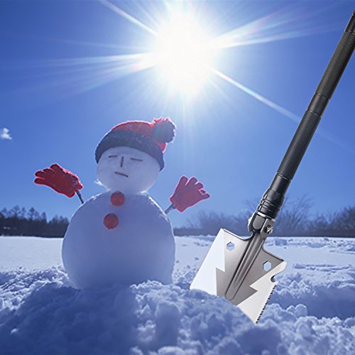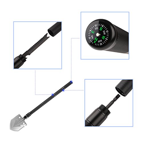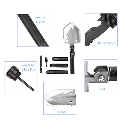 Multi function tool: Shovel, Hoe, Hook, Axe, Saw, Hammer, Rescue Knife, Wire Cutter, Bottle Opener, Fire Starter, Glass Breaker, Paracord, Measure.
