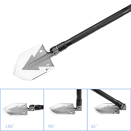 Unique design: Non-slip metal handle, thickened cutting edge, ergonomic design. Handles of the folding shovel fold twice. It is made to be compact in size when folded so it can easily be packed on a camping or beach trip or carried out to the garden.