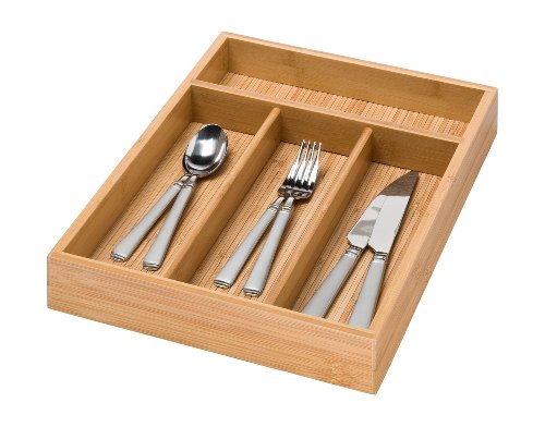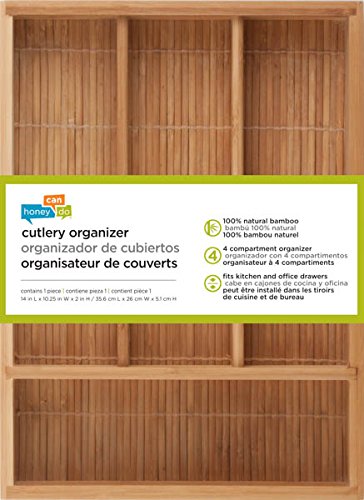Honey-Can-Do KCH-01078 Bamboo Cutlery Tray, Bamboo, 4-Compartment Tray. Styling is contemporary and will fit well with any kitchen décor, features bamboo with a bamboo veneer. Made from sustainable and renewable materials as an alternative to metal, timber, and plastic. Bamboo is gentle on utensils and will not scratch or leave marks on your silverware. Provides 4 compartments for organizing cutlery utensils. Fits in nearly all standard sized kitchen and pantry drawers at just 10.2-inches wide. Home organization made easy.
