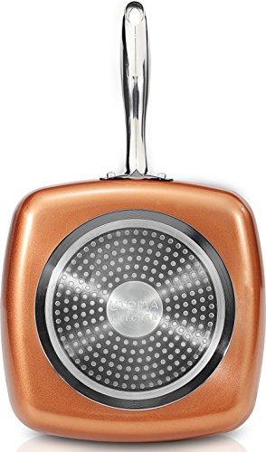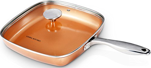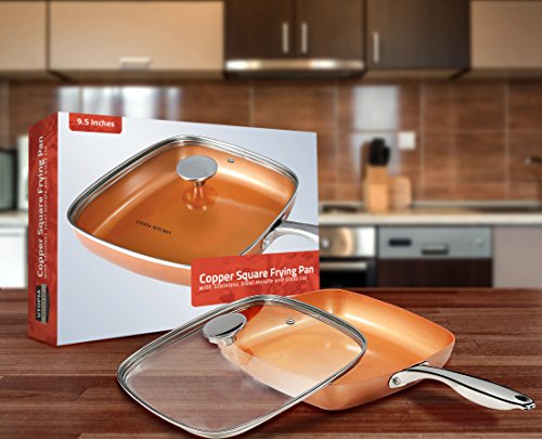 Includes square copper frying pan measuring 9.5 inches in length with stainless steel handle and 4 mm thick glass lid