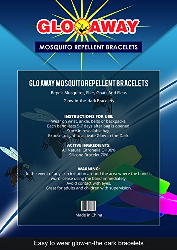 -. Feature : Glow-in-the-Dark Mosquito Repellent Bracelets / Deet Free! Only All Natural Citronella Oil. / 5 Pack of Mosquito Repellent Bracelets in Resealable bag. / Each bracelet lasts 5-7 days. / Great for the whole family! Hiking, camping, barbecues and any outdoor activity!